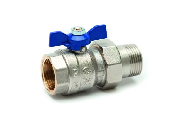 Nickel plated full-flow ball valve, with blue or red handle and fitting.
