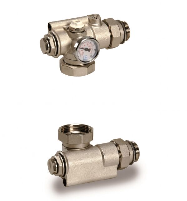 G 1” valve with pump connection for mixed heating system, max thermometer temperature 80 °C.