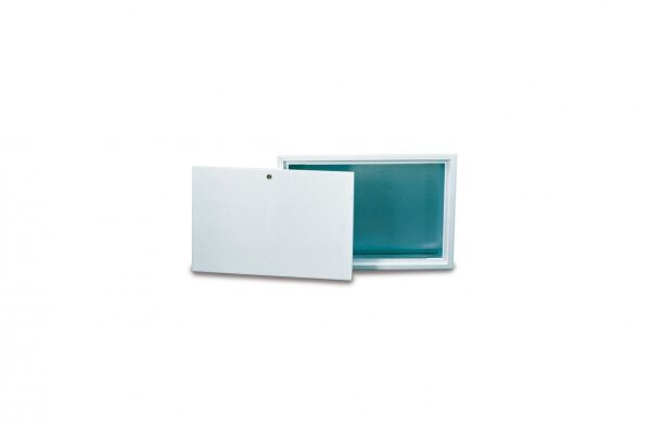Cassetta a muro per riscaldamento e sanitario in acciaio zincato, con telaio regolabile, porta e cornice verniciate di colore bianco RAL 9016 per collettori serie CD.