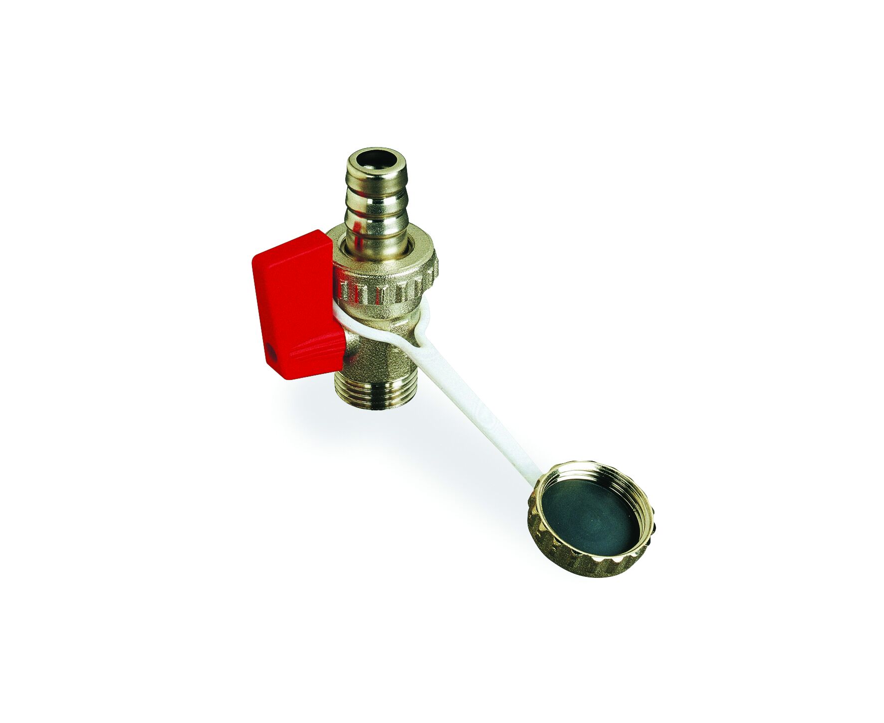 Valvola a sfera nichelata per scarico acqua con leva, portagomma e tappo.
