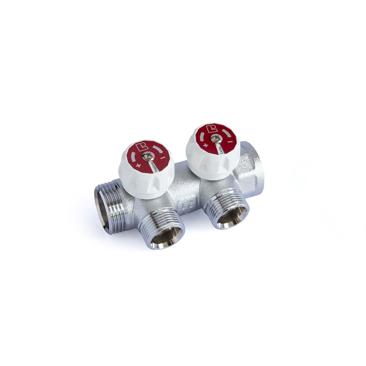 Collettori a due vie con valvole di intercettazione frontali. Attacchi maschio G3/4 Eurocono.