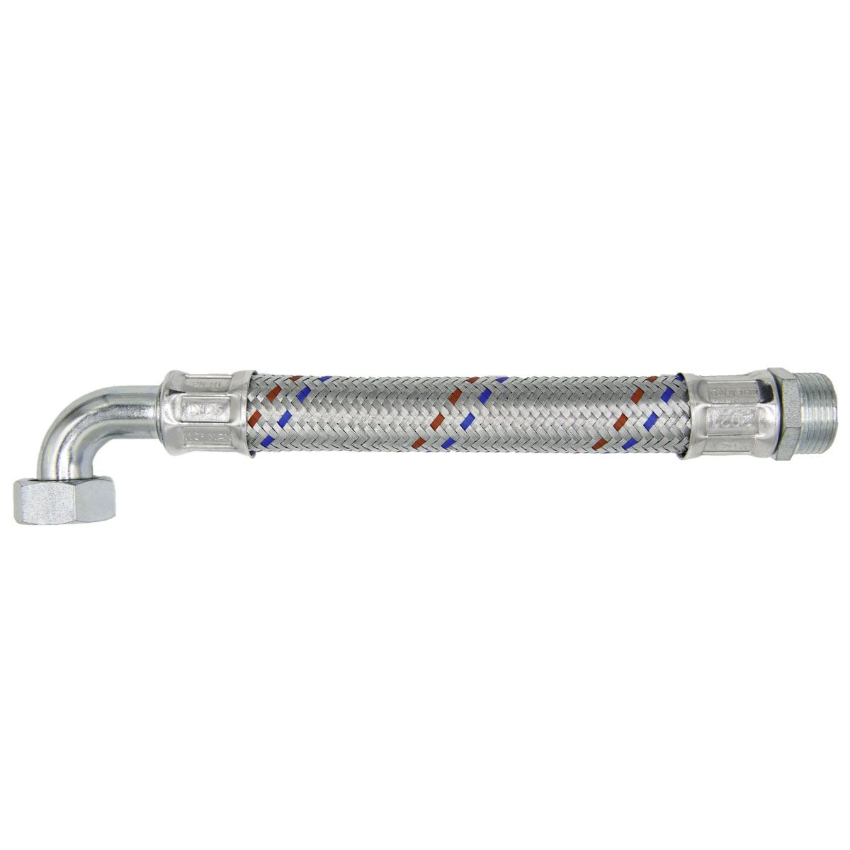 Tubo flessibile DN 15 in acciaio zincato per applicazioni industriali dove è necessaria una portata elevata ed una temperatura massima elevata (pompe, colonne montanti, impianti di riscaldamento ecc.). Raccordo Maschio e Femmina Curva.