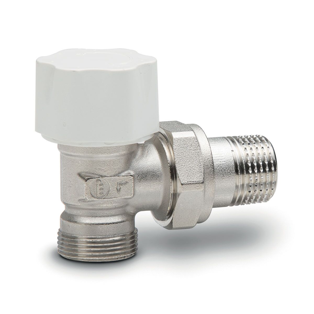 Valvola radiatore a squadra termostatizzabile o elettrocomandabile con cappuccio di protezione.